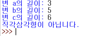사용자로부터 세 변의 길이 a,b,c를 입력받아 피타고라스 정리를 이용해 직각삼각형을 판별하는 프로그램을 작성해보자.