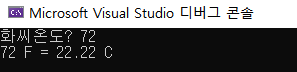▶ double c = (f - 32) * (5.0 / 9.0) : 정수형으로 5/9를 계산하면 몫 값인 0을 반환하기 때문에 실수형으로 변경해야 함