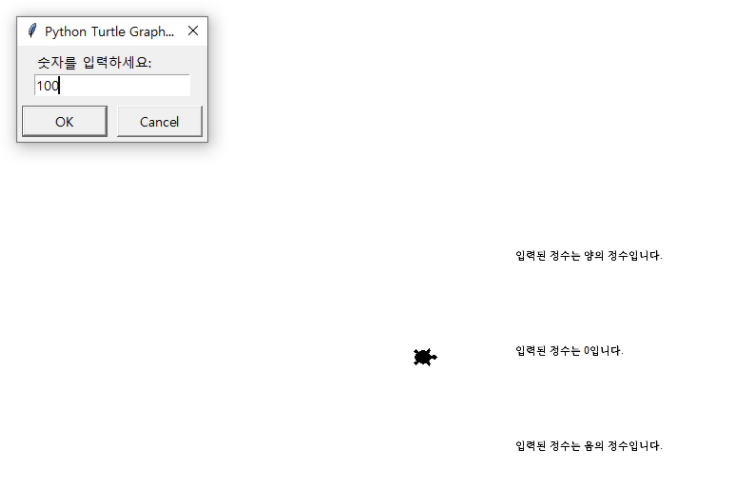 사용자로부터 정수를 입력받아 정수의 종류에 따라 거북이가 양의 정수, 0, 음의 정수 메시지가 있는 위치로 이동하는 프로그램을 작성해보자.