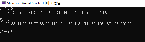 이 함수를 이용해서 입력받은 정수의 배수를 20개씩 출력하는 프로그램을 작성해보자.