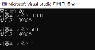 ▶ 할인율은 처음 입력받은 값으로 동일하게 계속 적용되기 때문에 while문 밖에 작성함
