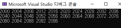 이 함수를 이용해서 2000년부터 2100년 사이에 있는 윤년을 모두 구해서 출력하는 프로그램을 작성해보자.
