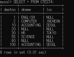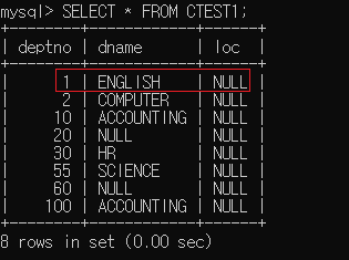 ▶ CTEST1의 정보를 출력해보면 deptno 컬럼의 값이 1이었던 행이 삭제된 것을 확인할 수 있음