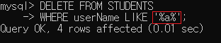 ▶ STUDENTS 테이블에서 이름에 a가 들어가는 학생의 행 삭제