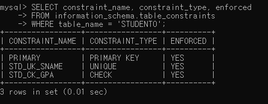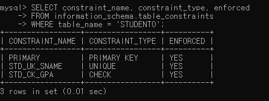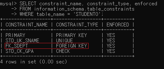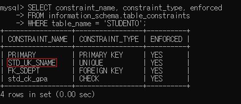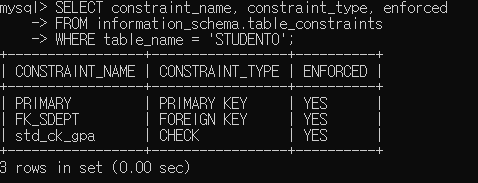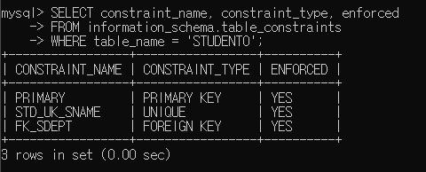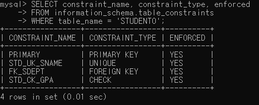 ▶ 제약조건을 추가한 후 STUDENT0 테이블의 제약조건을 확인해보면 정상적으로 추가되었음을 확인할 수 있음