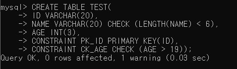 ▶ PRIMARY KEY, CHECK 제약 조건을 가진 TEST 테이블 생성