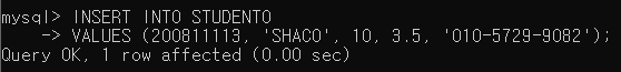 ▶ STUDENT0 테이블의 SNO, SNAME, SDEPT, GPA, STEL 컬럼에 순서대로 200811113, 'SHACO', 10, 3.5, '010-5729-9082' 값을 삽입