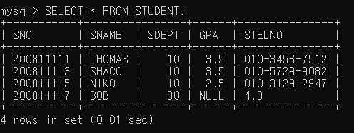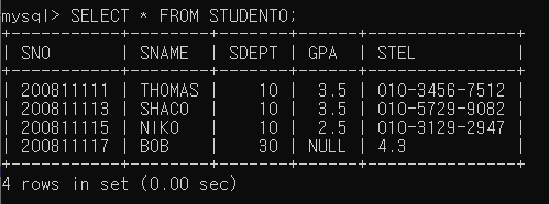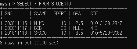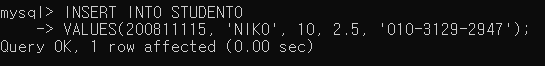▶ STUDENT0 테이블의 SNO, SNAME, SDEPT, GPA, STEL 컬럼에 200811115, 'NIKO', 10, 2.5, '010-3129-2947' 값을 삽입함