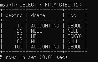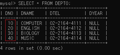 ▶ DEPT0 테이블의 모든 정보를 출력해보면 컬럼이 정상적으로 추가되었음을 확인할 수 있음
