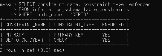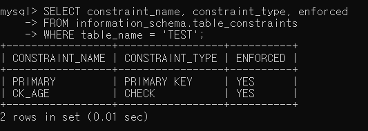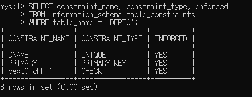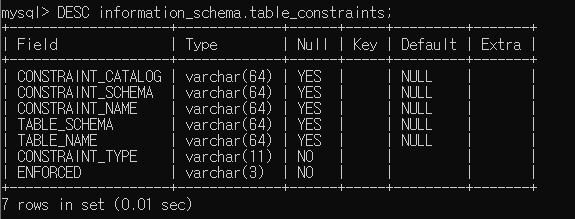 - 제약조건 정보는 INFORMATION_SCHEMA 데이터베이스의 TABLE_CONSTRAINTS 테이블에 저장되어 있음