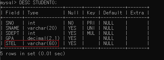 ▶ STUDENTS0 테이블의 구조를 확인하면 STEL 필드의 타입이 정상적으로 변경되었음을 볼 수 있음