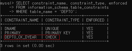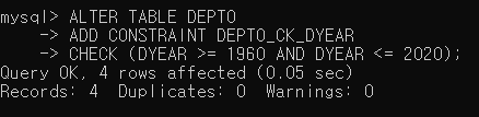 ▶ DEPT0 테이블에 위 조건에 해당하는 DEPT0_CK_DYEAR 제약 조건을 설정