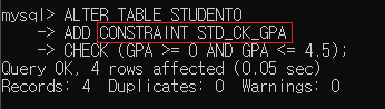 ▶ STUDENT0 테이블에 STD_CK_GPA라는 CHECK 제약조건을 추가하되, GPA가 0 이상이고 4.5 이하여야 한다는 조건을 가짐