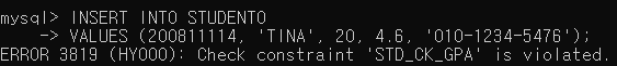 ▶ STUDENT0 테이블의 제약조건을 확인하면 STD_CK_GPA가 새로 생겼음을 확인할 수 있음