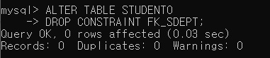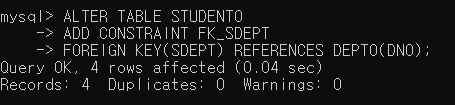 ▶ DEPT0 테이블의 DNO 컬럼을 참고하여 STUDENT0 테이블에 FK_SDEPT라는 SDEPT 컬럼의 외래키 제약조건을 생성