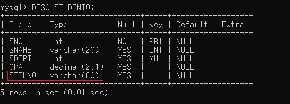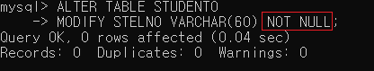 ▶ STUDENT0 테이블의 STELNO 필드에 NOT NULL 제약조건을 추가