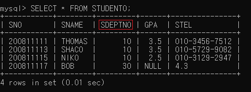 ▶ STUDENT0 테이블의 SDEPT 컬럼명이 SDEPTNO으로 변경됨