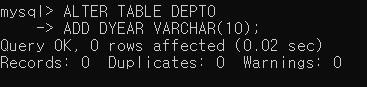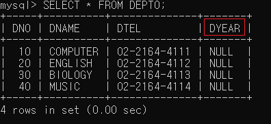 DEPT0 테이블에 DYEAR 컬럼을 추가해보자.