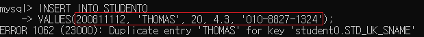 ▶ 동일한 테이블의 컬럼에 200811112, 'THOMAS', 20, 4.3, '010-8827-1324' 값을 추가하려고 하면 오류가 발생함