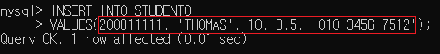 ▶ STUDNET0 테이블의 SNO, SNAME, SDEPT, GPA, STEL 컬럼에 순서대로 200811111, 'THOMAS', 10, 3.5, '010-3456-7512' 값을 삽입