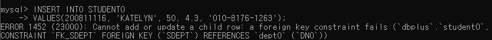 → STUDENT0 테이블의 외래키는 DEPT0 테이블의 DNO를 참고하여 STUDENT0 테이블의 SDEPT로 가져오는데, 삽입하려는 데이터는 50으로 DEPT0 테이블의 DNO 컬럼에 존재하지 않는 값이기 때문에 참고할 수 없어 발생함