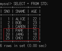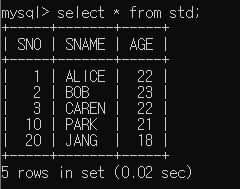 ▶ STD 테이블의 정보를 출력해보면 모두 삽입된 것을 확인할 수 있음