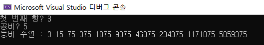 첫 번째 항의 값과 공비(common ratio)를 입력받아서 배열을 채우고 출력하는 프로그램을 작성해보자.