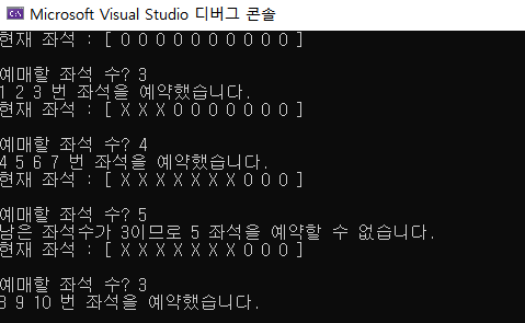 예매할 좌석수를 입력받아 빈 자리를 할당하고 예매할 때마다 각 좌석의 상태를 출력한다.