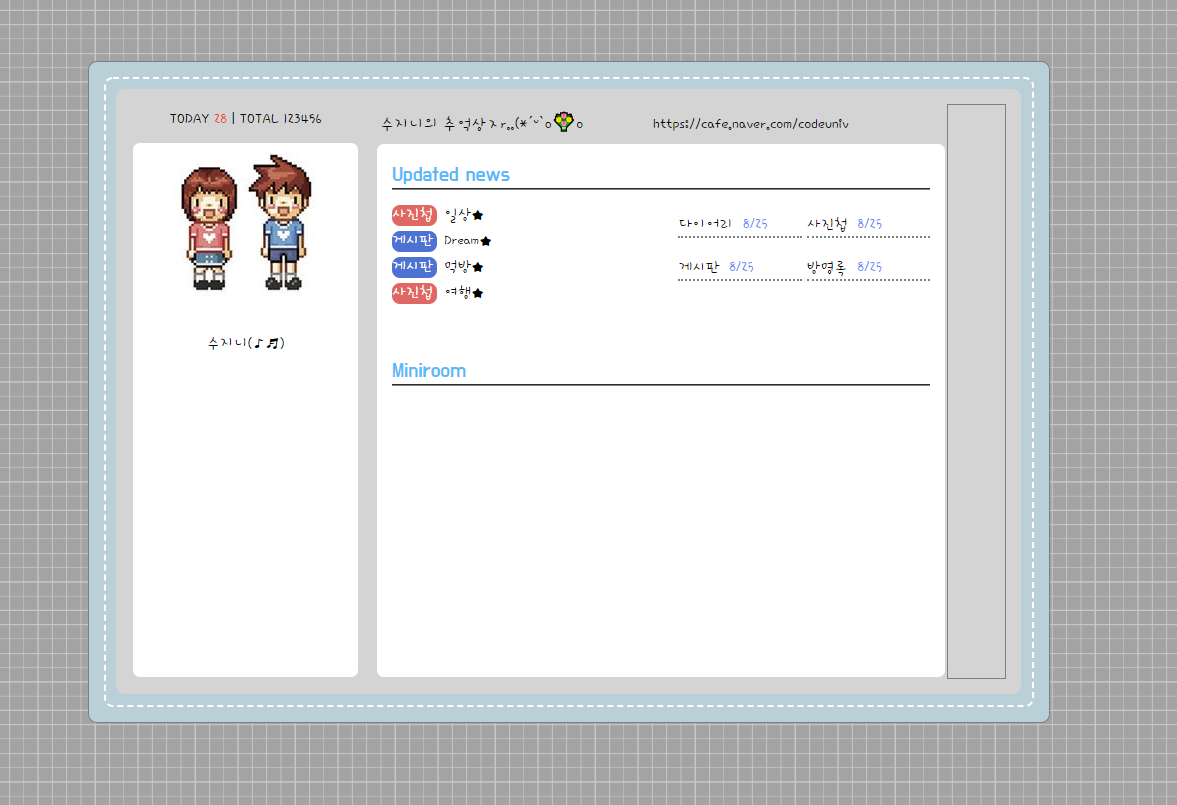 | [ Visual Studio Code ] 싸이월드 페이지 만들기 - ① (0) | 2021.12.26 |