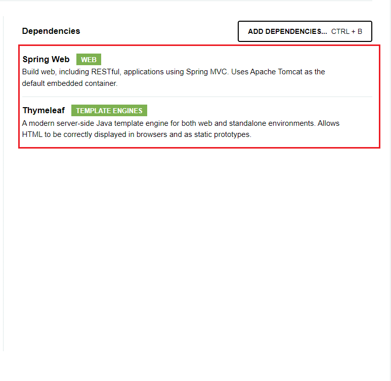 ▶ ADD DEPENDENCIES를 선택해 Spring Web과 Thymeleaf 라이브러리 추가