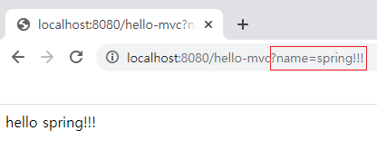 ▶ 주소창에 localhost:8080/hello-mvc?name=spring!!!을 입력하면 결과가 출력됨