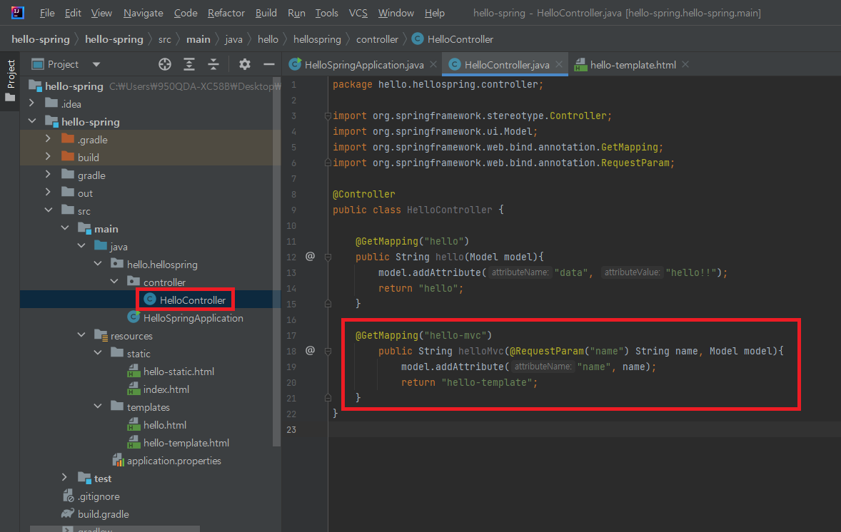 helloController에서 return 값으로 hello-template을 가짐