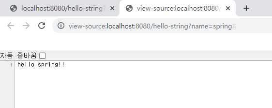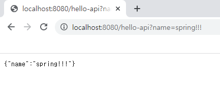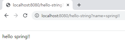▶ localhost:8080/hello-string?name=spring!!을 요청하면 hello 뒤에 name으로 입력한 spring!!이 출력됨
