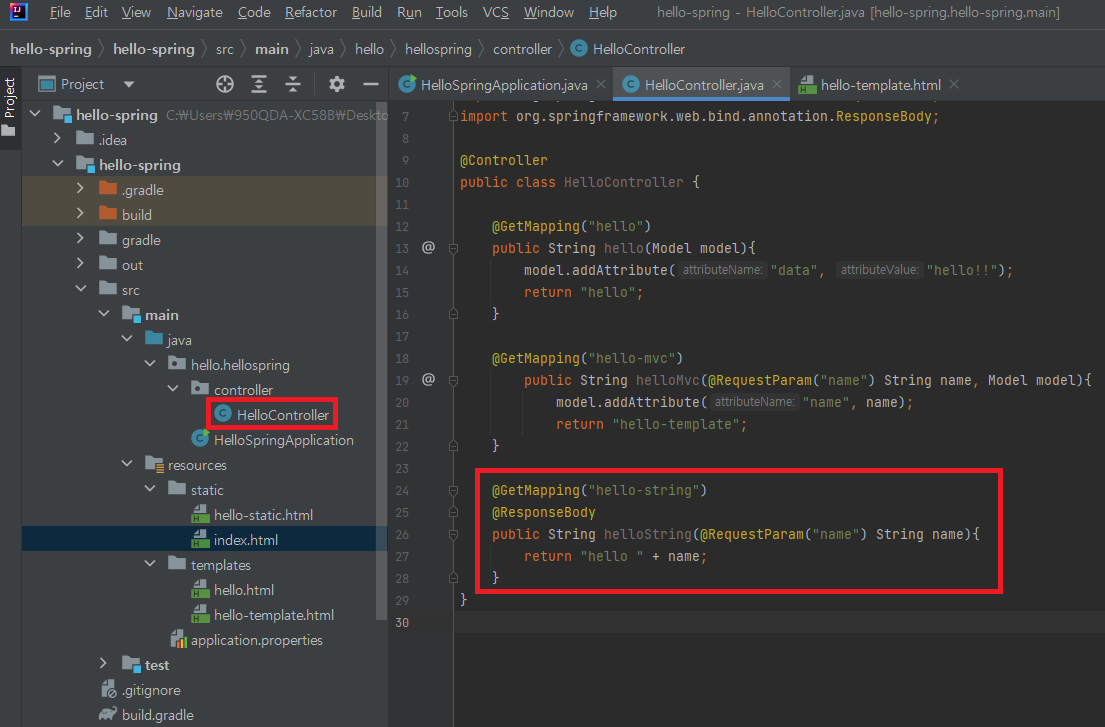 ▶ @ResponseBody : HTTP의 body에 문자 내용을 직접 반환함