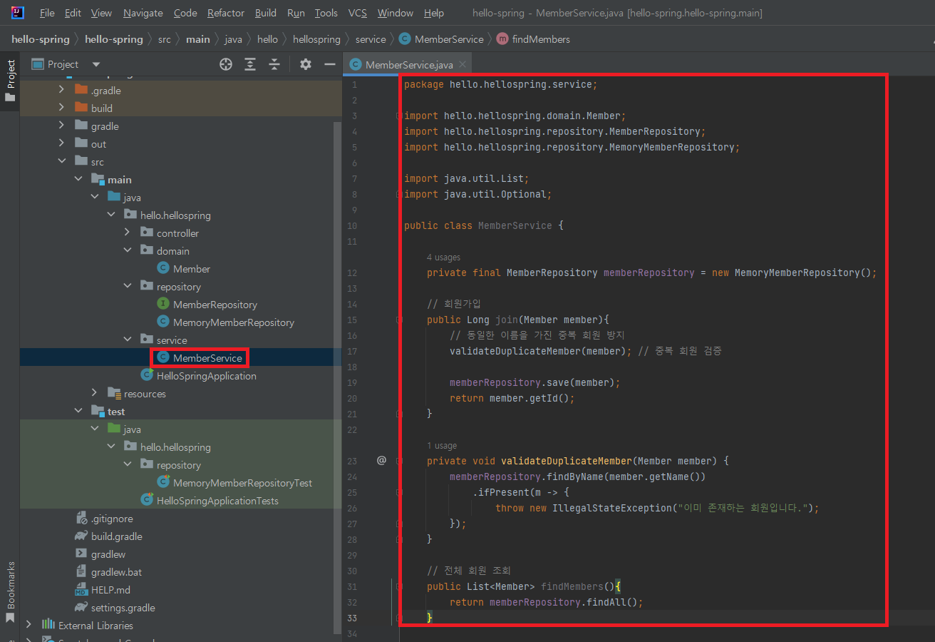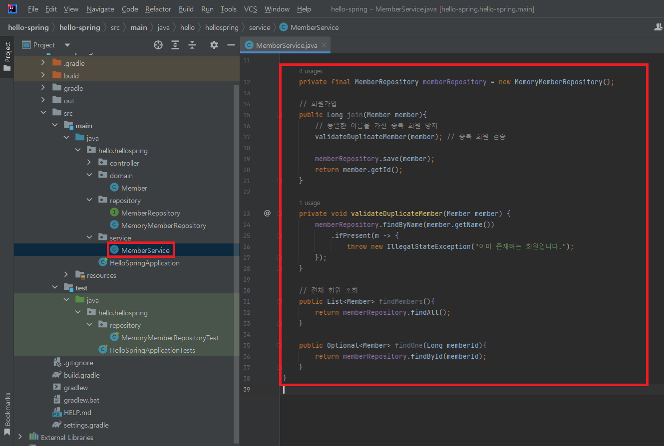 ▶ memberRepository.findByName(member.getName()).ifPresent(m -> {throw new IllegalStateException("이미 존재하는 회원입니다.");}) : memberRepository에서 이름을 찾아 존재한다면 "이미 존재하는 회원입니다." 출력