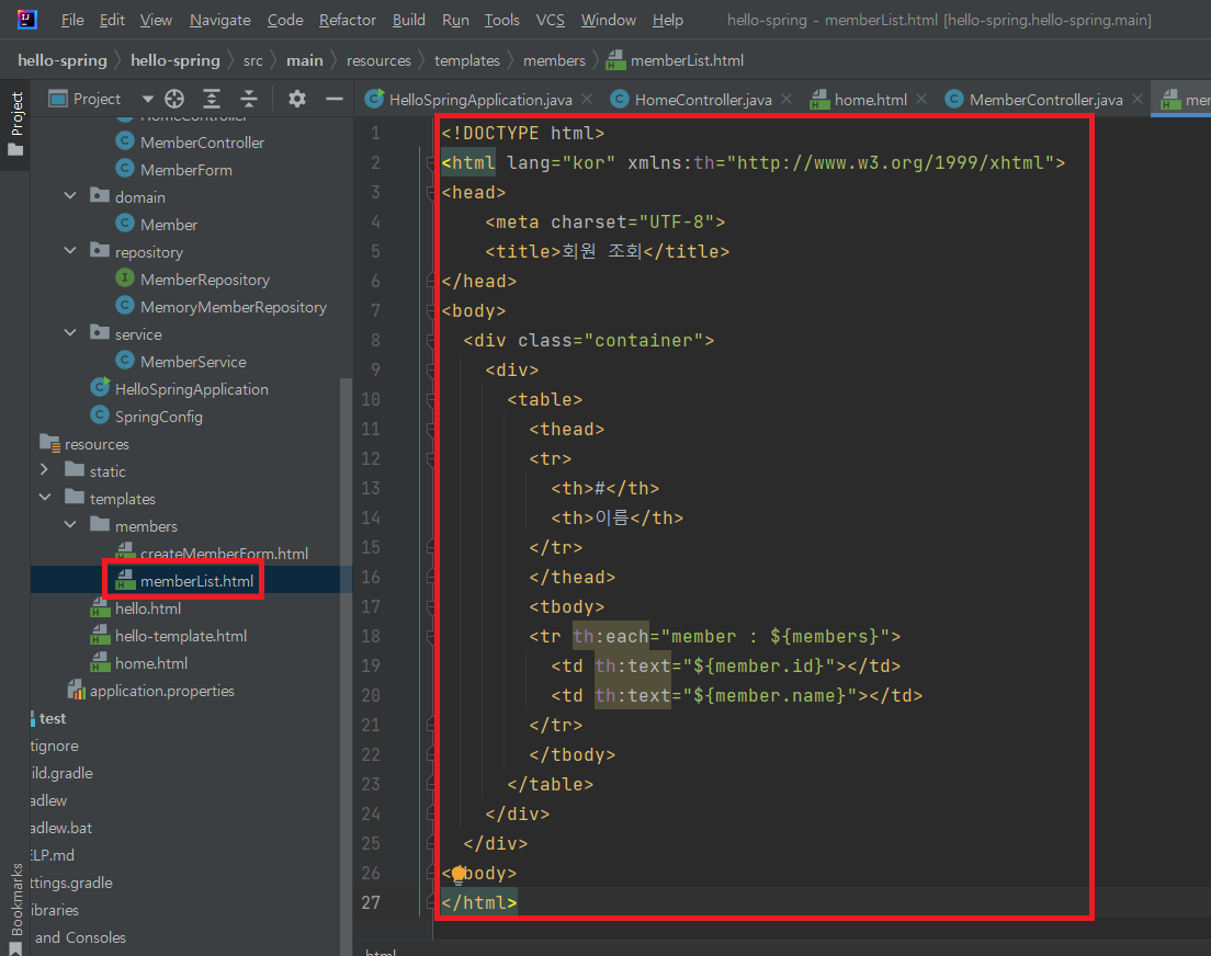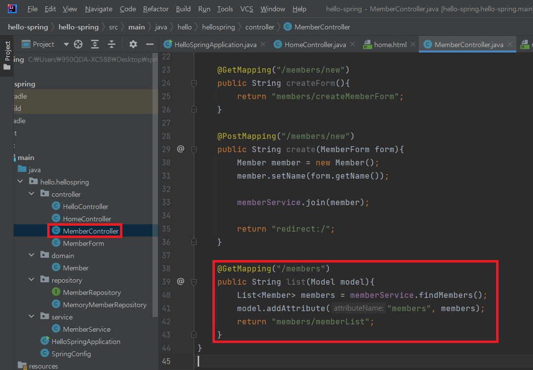 ▶ model.addAttribute("members", members) : html 파일에서 members를 사용