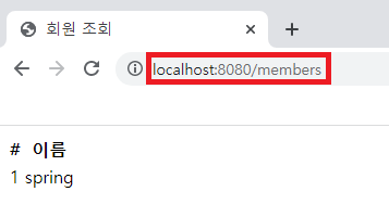 ▶ localhost:8080/members에 접속하면 localhost:8080/members/new에서 회원가입한 이름이 순서대로 나옴