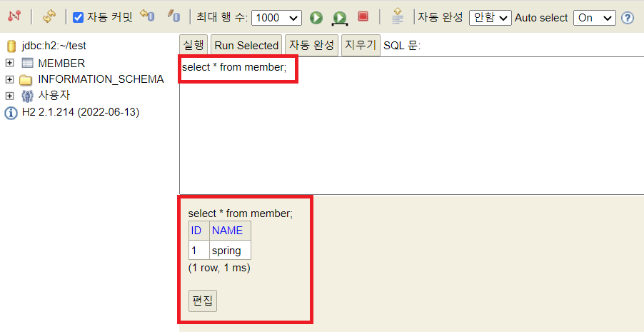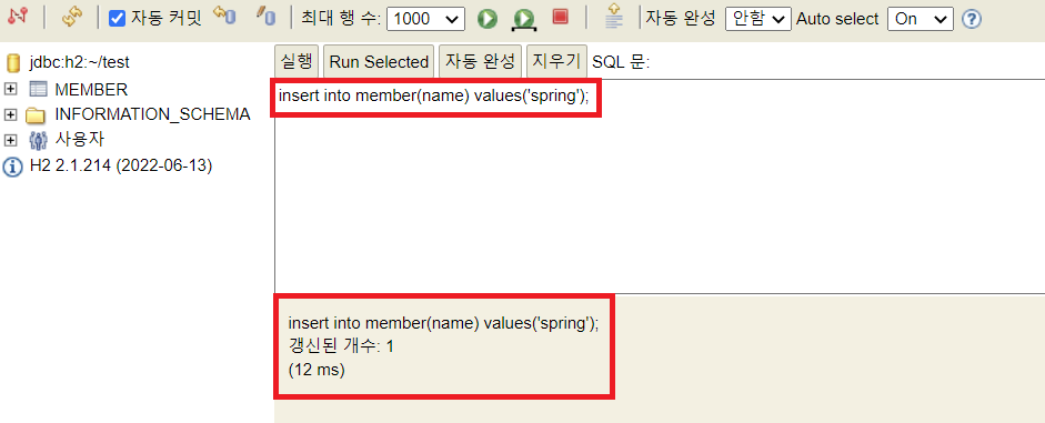 ▶ insert into member(name) values('spring') : member 테이블의 name 컬럼에 spring 값을 대입