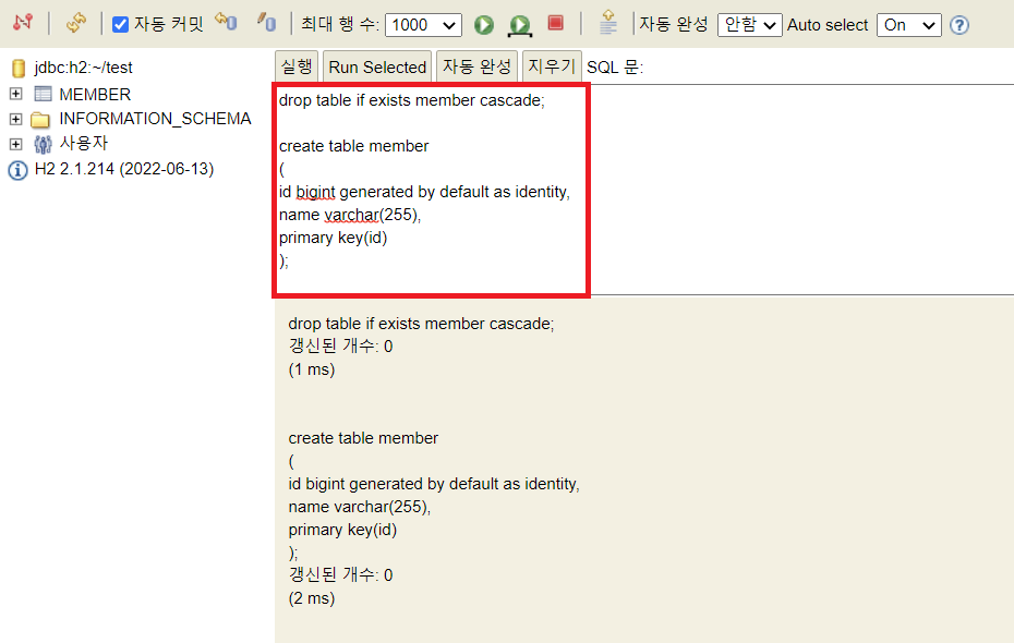 ▶ drop table if exists member cascade : member 테이블이 존재할 경우 테이블 전체 삭제