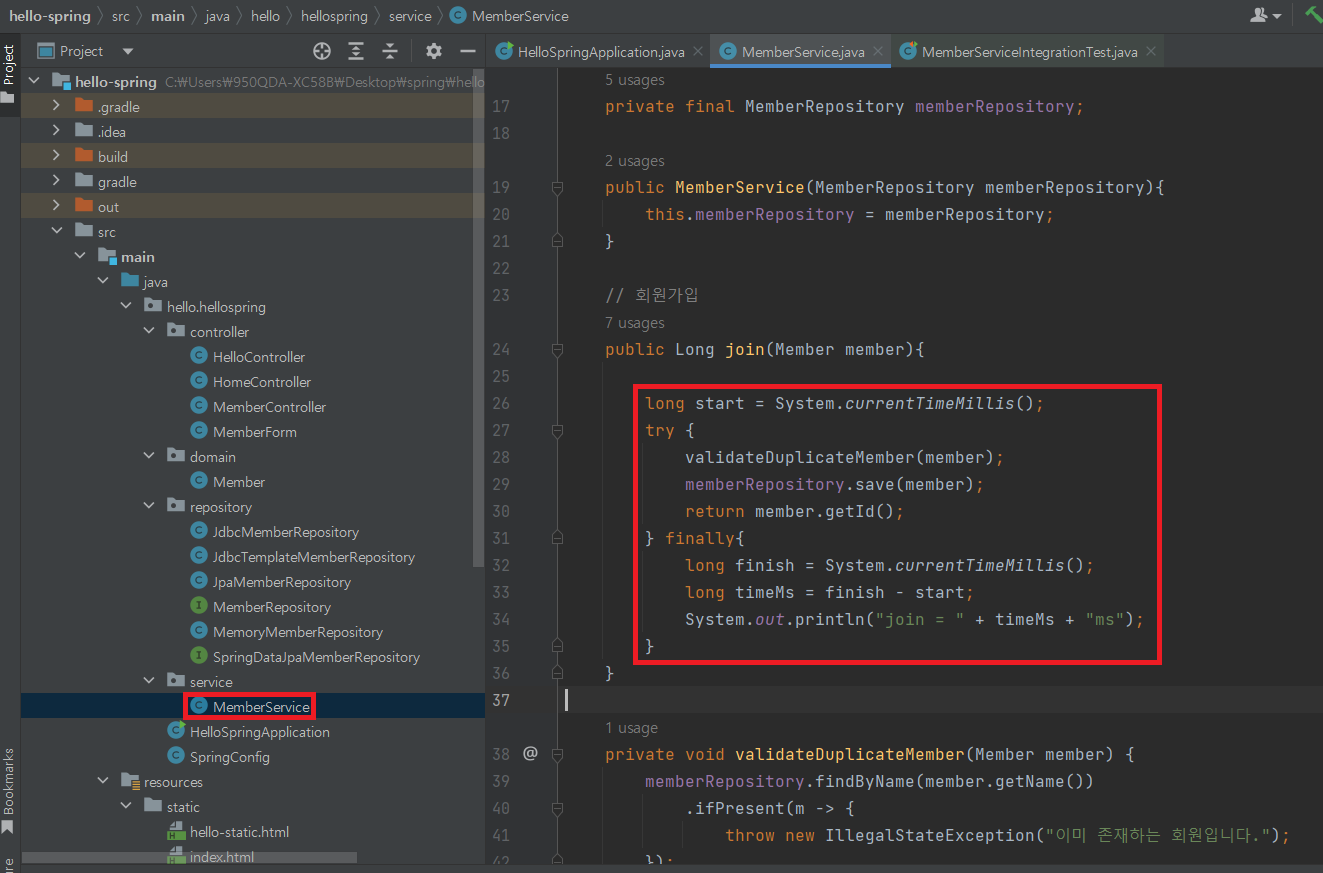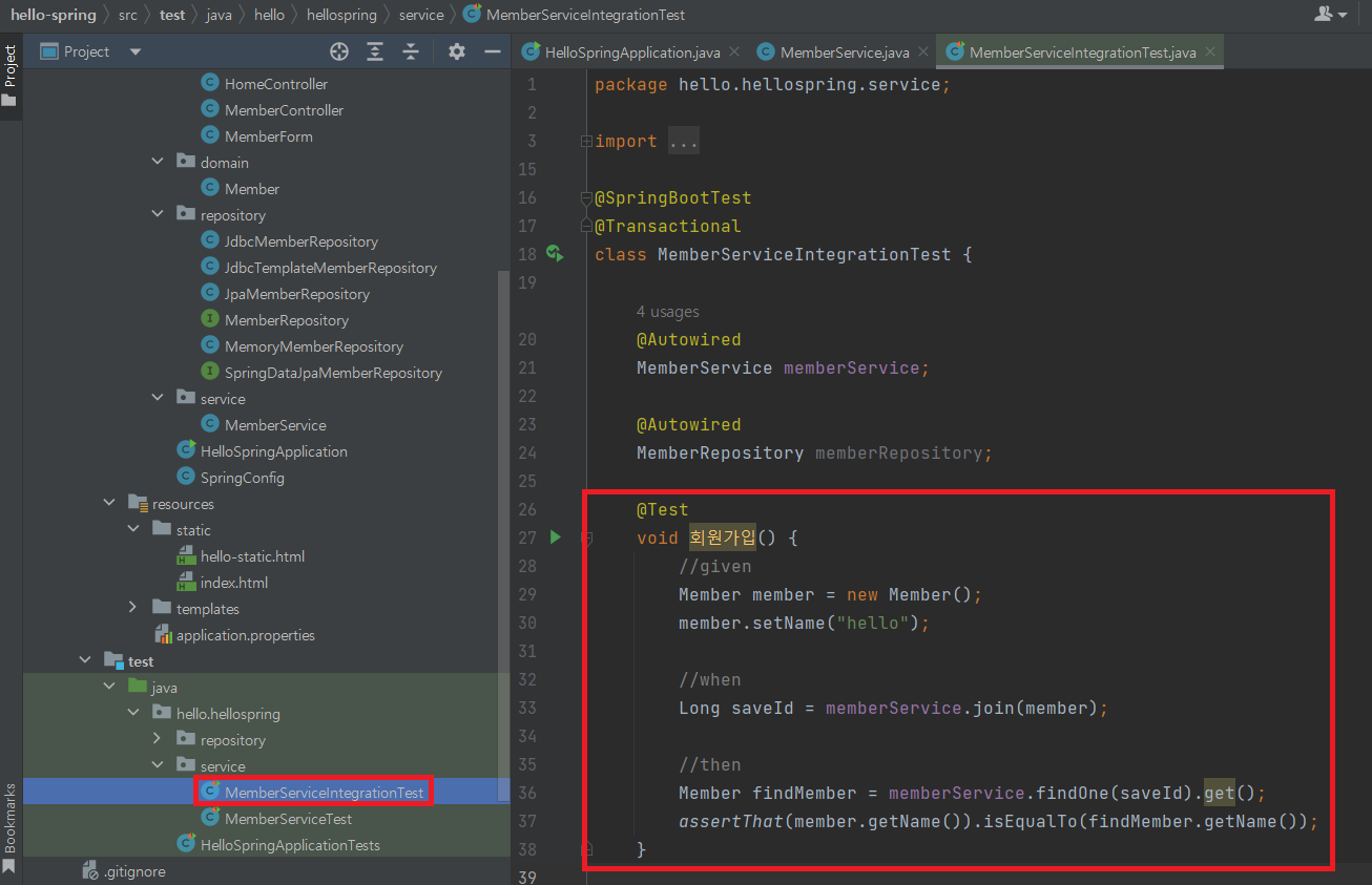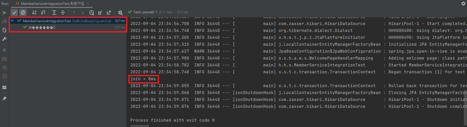 ▶ MemberServiceIntegrationTest 파일의 회원가입을 실행시키면 정상 작동