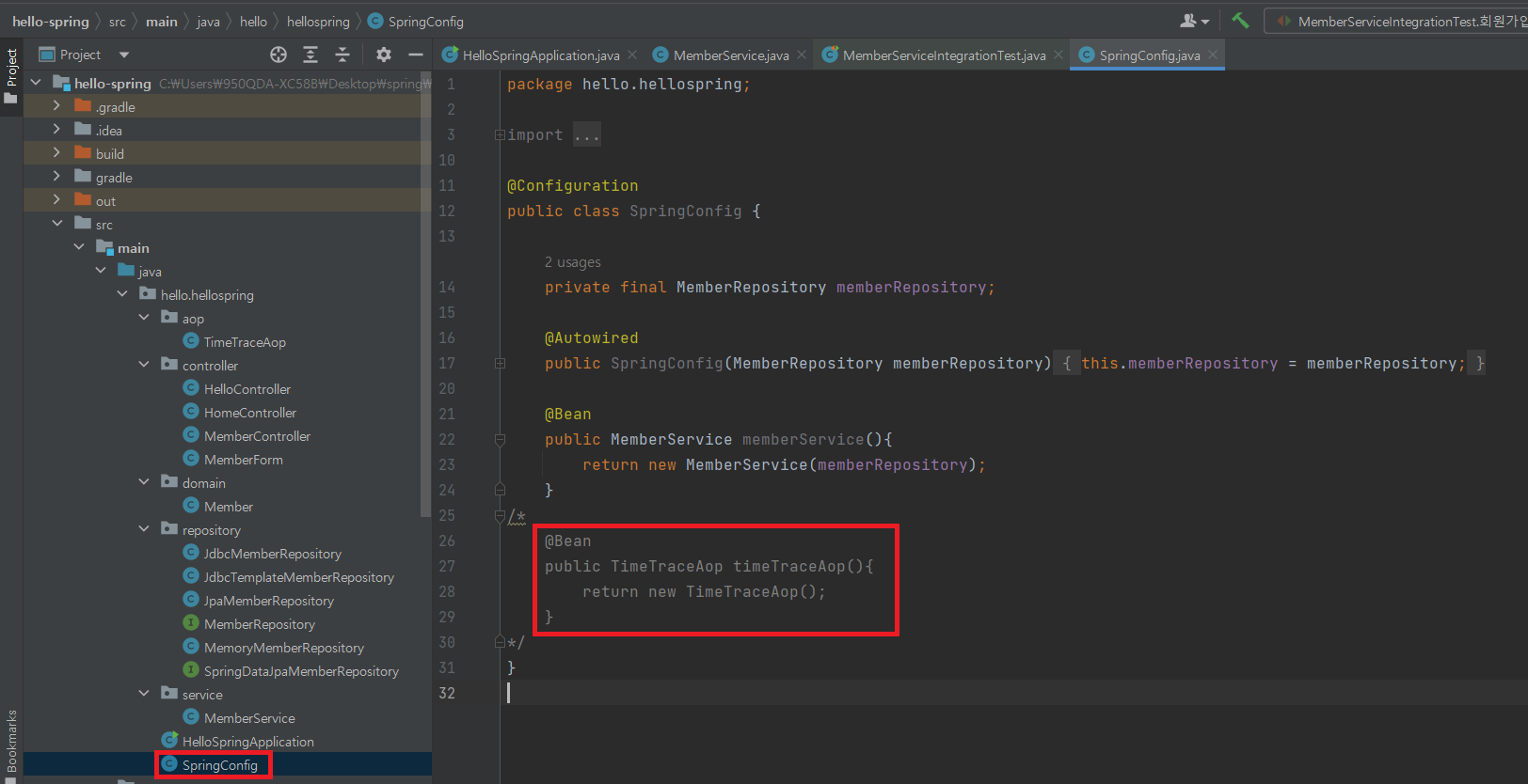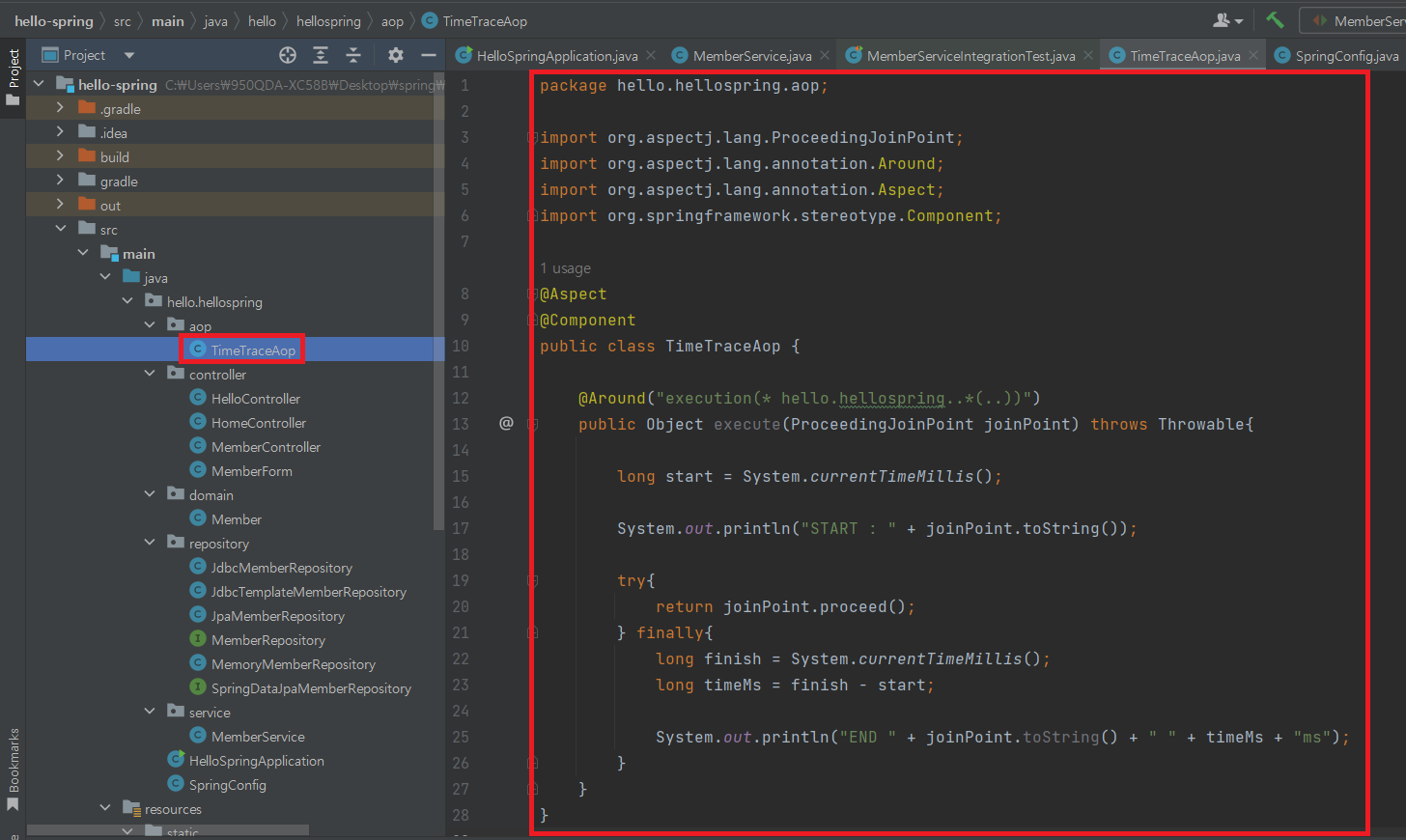 - 회원가입, 회원 조회 등 핵심 관심사항과 시간을 측정하는 공통 관심 사항을 분리함