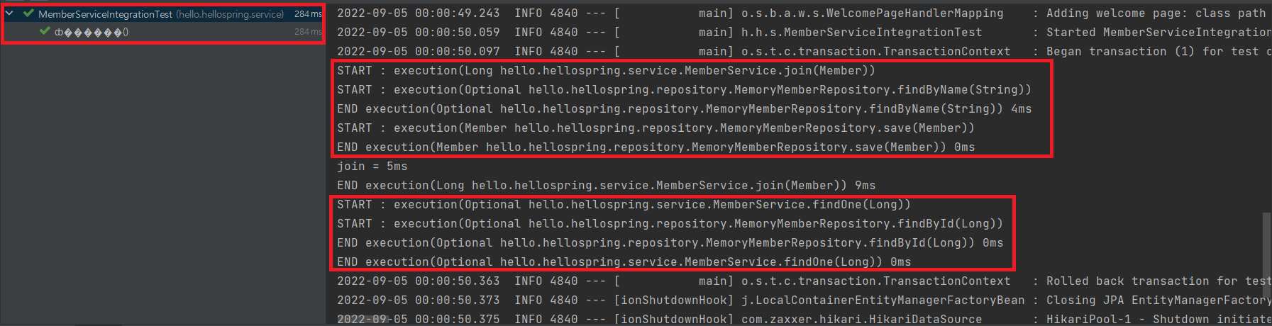 ▶ MemberServiceIntegrationTest 파일을 실행해보면 정상적으로 작동