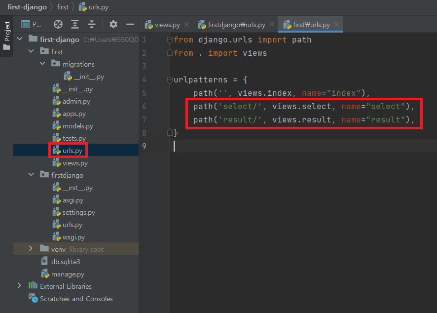 → path('select/', views.select, name="select") : views 파일의 select 메소드를 불러와 '루트 경로/select/'로 진입하면 select 메소드에 해당하는 view 파일을 볼 수 있음