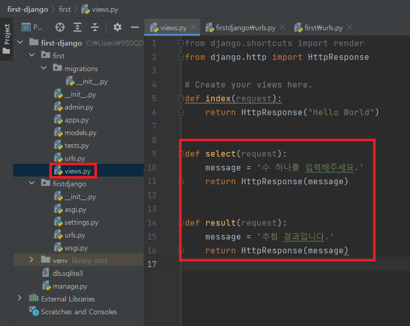 ▶ views.py 파일에 새로운 메소드를 추가함