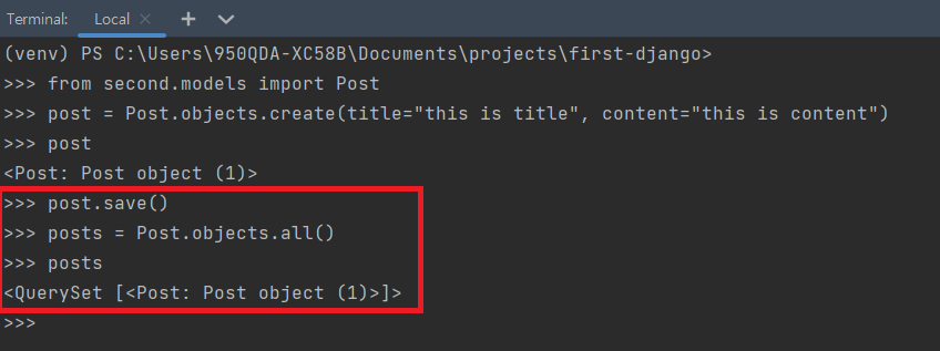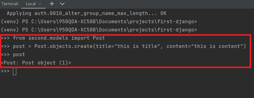 ▶ post = Post.objects.create(title="this is title", content="this is content") : Posts 메소드에 레코드 하나 저장