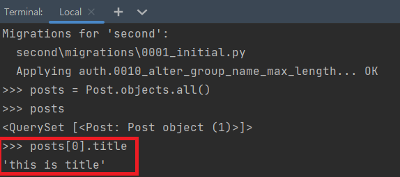 ▶ post = Post.objects.create(title="this is title", content="this is content") : Posts 메소드에 레코드 하나 저장