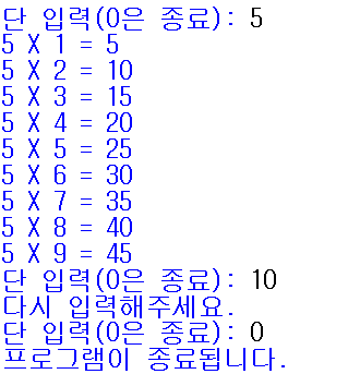 단, 입력되는 단은 1~9 사이의 값으로 제한하며, 잘못 입력하면 다시 입력받도록 한다.