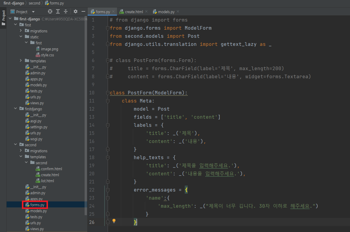 ▶ labels = {'title' : _('제목'), 'content' : _('내용')} : 각 필드의 라벨 명시