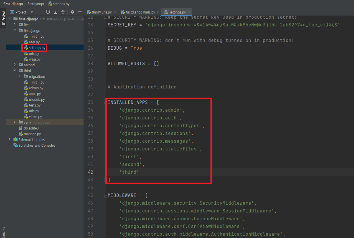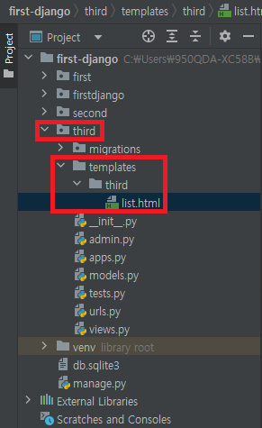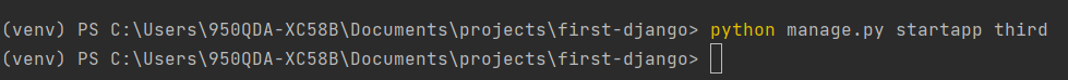 ▶ python manage.py startapp third : third라는 새로운 웹 앱을 생성함