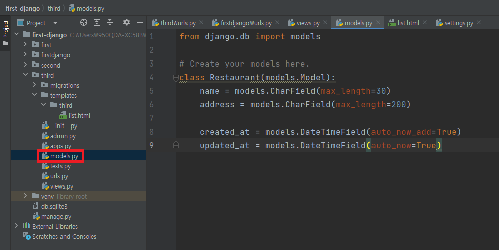 ▶ class Restaurant(models.Model) : Restaurant이라는 모델 정의